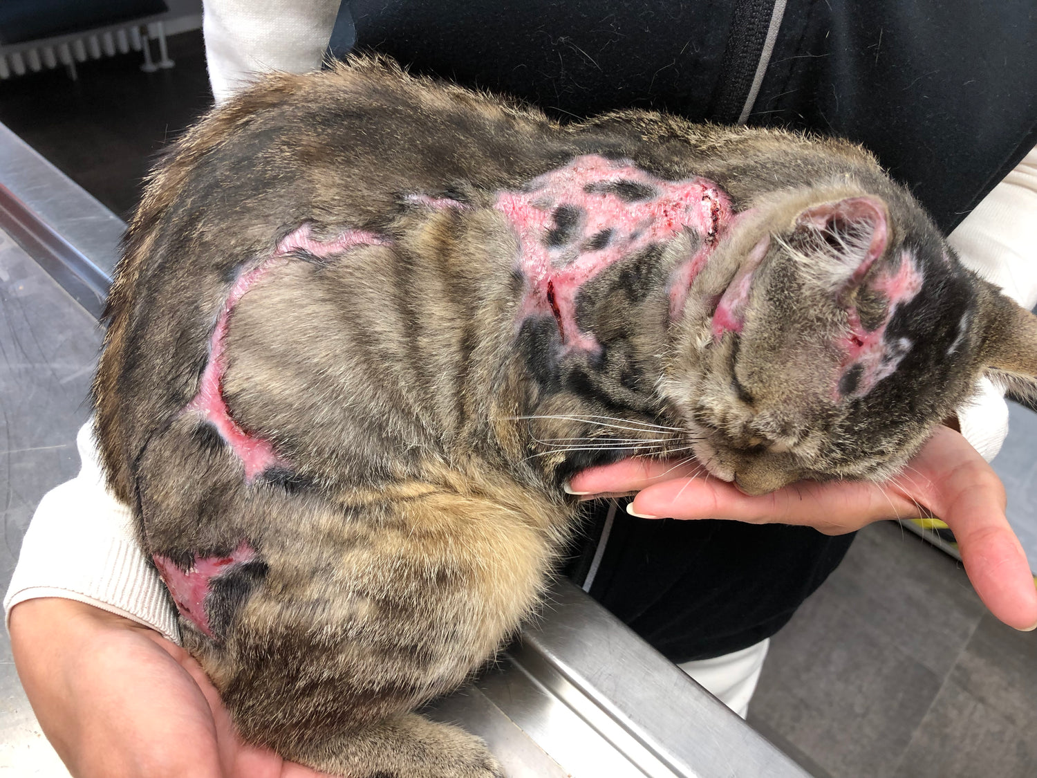 Die Haut erholt sich gut . Keine Schmerzen bei Berührung . Haare wachen zum größten Teil wieder nach.